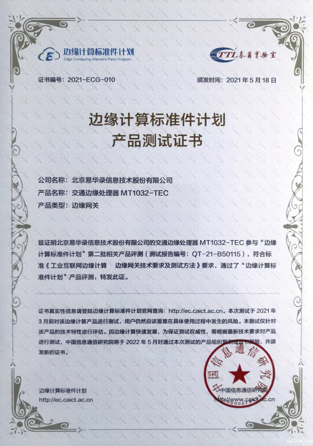 为解决边缘计算在规模化部署过程中存在的供给侧研发方向不明确、需求侧建设选型困难、设备及平台标准缺失、可信开放测试机制不完善等突出问题,2020年,中国信通院联合产业各方发起 “边缘计算标准件计划”,旨在形成“技术研发、标准研制、产品检测、应用示范、规模商用”的产业闭环,推动我国边缘计算发展迈向新阶段。2021年9月28日,以“促进基础设施建设,引领网络技术创新”为主题的2021工业互联网网络创新大会在北京举行,会上伟德app手机下载官网安卓版自研的交通边缘处理器设备MT1032-TEC荣获中国信息通信研究院颁发的“边缘计算标准件计划”产品评测证书。