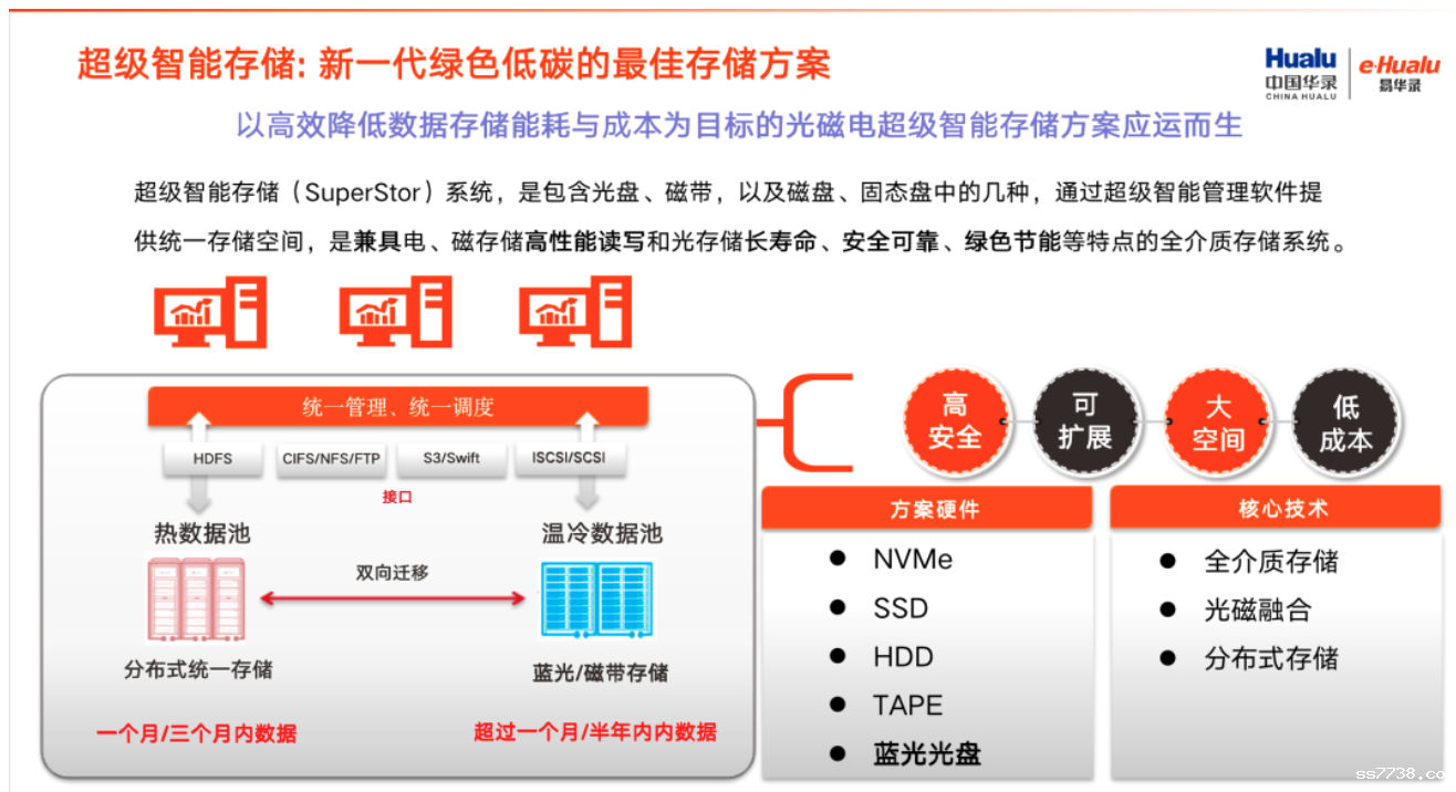 针对以上问题,以高效降低数据存储能耗与成本为目标的磁光电超级智能存储方案应运而生。超级智能存储(SuperStor)系统,包含光盘、磁带、磁盘及固态盘多种存储介质,通过超级智能管理软件提供统一存储空间,是兼具电、磁存储高性能读写和光存储长寿命、安全可靠、绿色节能等特点的全介质存储系统。