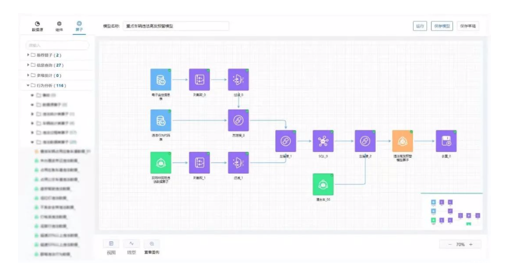 目前,已具备面向违法过滤、事故违法、车辆违法、标签业务这4大类提供139个算子,实现了通过挖掘海量数据来捕获情报,完成对人车异常状态、运行轨迹、活动规律等的实施监控与预警。实战应用过程中,向用户提供模型超市统一门户,上线了企业风险等级评估模型、外埠货车事故违法模型、超标电动自行车分析模型、文明路口邮政寄递分析、外卖车分析模型、非现场违法高发模型、一车多人模型、现场涉酒违法分析模型、非现场设备异常分析模型、非现场行政复议分析模型等十余项高价值业务模型,极大的降低大数据技术门槛,通过积木式建模、克隆式共享让业务专家更加专注于业务革新。