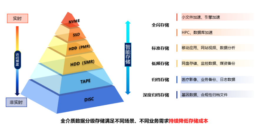 超级智能存储支持全介质、全场景的数据存储,融合了磁、光、电三类存储介质性能优势,围绕数据全生命周期管理将数据进行热、温、冷分级存储,通过不同存储介质之间优势互补,从而实现用户长时间、低成本、高节能、安全可靠的海量数据存储要求,满足企业数据一站式存储。