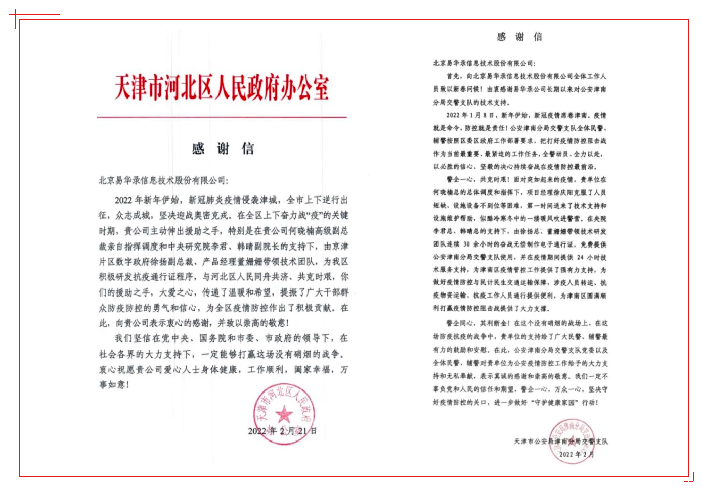 2月21日,伟德app手机下载官网安卓版收到天津市河北区人民政府办公室和天津市公安局津南分局交警支队发来的感谢信,信中对公司全力奋战防疫最前沿,持续提供技术与服务支持的倾情奉献表示由衷感谢。
