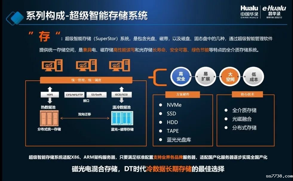 “超存”是围绕伟德app手机下载官网安卓版”收、存、治、用、易“主航道中“收”与“存”打造的智能存储解决方案。方案包含了业界首款全介质分布式分级存储系统“超级智能存储系统(SuperStore)”、自主可控的领先核心存储设备“蓝光光盘库”、唯一支持光磁双介质的“湖盘”、支持多协议在线迁移工具“Esync”、支持大容量数据离线迁移的“数据快D箱”。