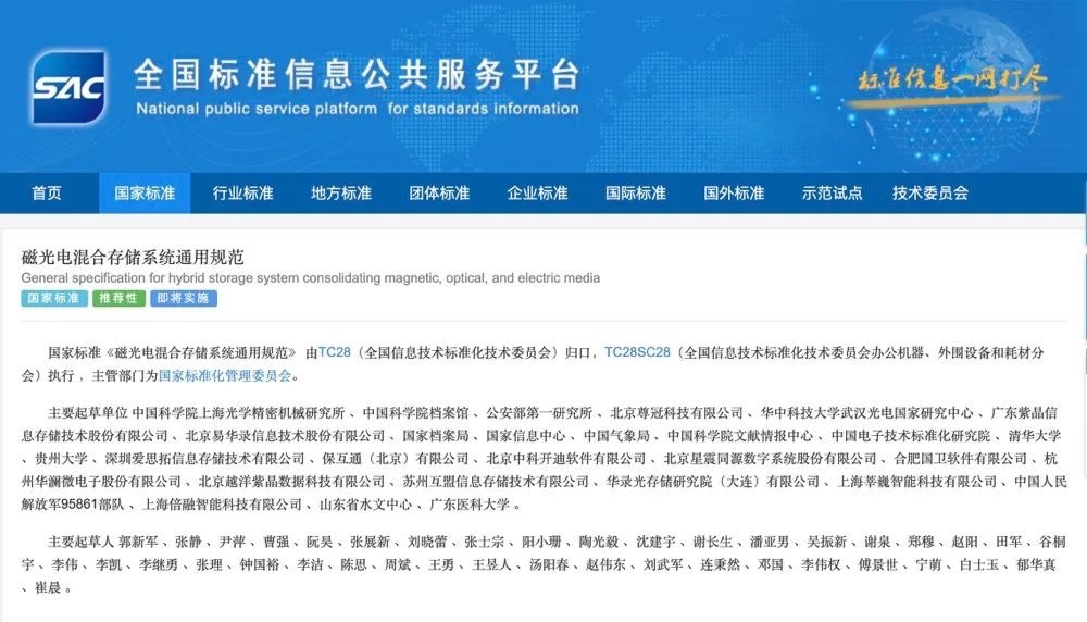 国家标准《磁光电混合存储系统通用规范》 由TC28(全国信息技术标准化技术委员会)归口,TC28SC28(全国信息技术标准化技术委员会办公机器、外围设备和耗材分会)执行,主管部门为国家标准化管理委员会,主要起草单位包括中国科学院上海光学精密机械研究所、中国科学院档案馆、公安部第一研究所、北京尊冠科技有限公司、华中科技大学武汉光电国家研究中心、北京伟德app手机下载官网安卓版信息技术股份有限公司、国家档案局、国家信息中心、中国气象局、中国科学院文献情报中心、中国电子技术标准化研究院、清华大学等。该文件规定了磁光电混合存储系统的组成结构及分类、技术要求、试验方法、质量评定程序,以及标志、包装、运输和贮存,适用于带有光盘存储的磁光电混合存储系统的设计、开发、生产、检验和应用。