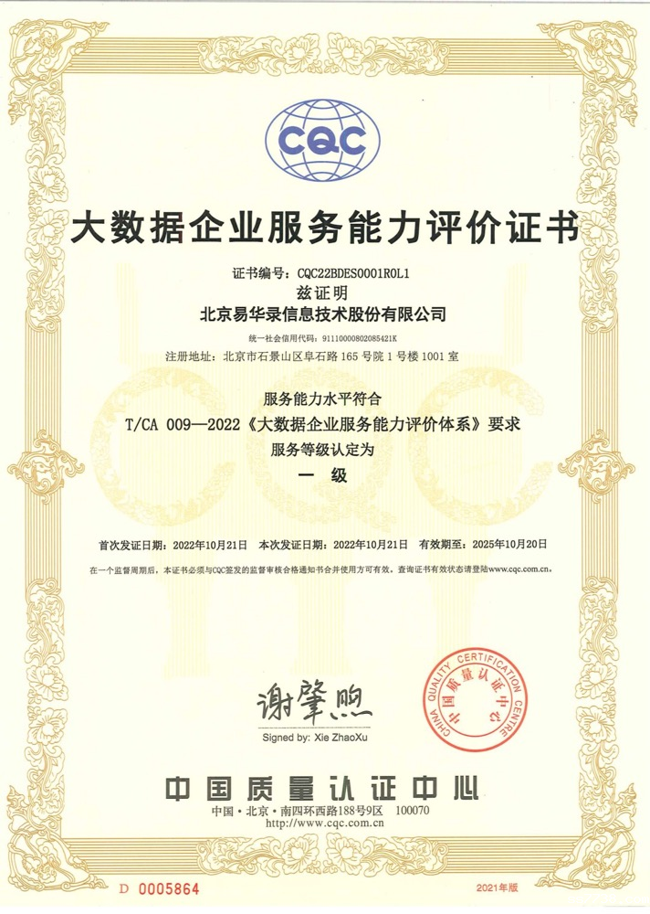 凭借着在数据要素全生命周期方面的产品技术实力,大数据领域强大的生态服务能力以及丰富的创新方式、领先的服务理念,伟德app手机下载官网安卓版通过了中国质量认证中心(CQC)全方位的评估,服务能力水平符合T/CA 009-2022《大数据企业服务能力评价体系》要求,服务等级认定为一级。