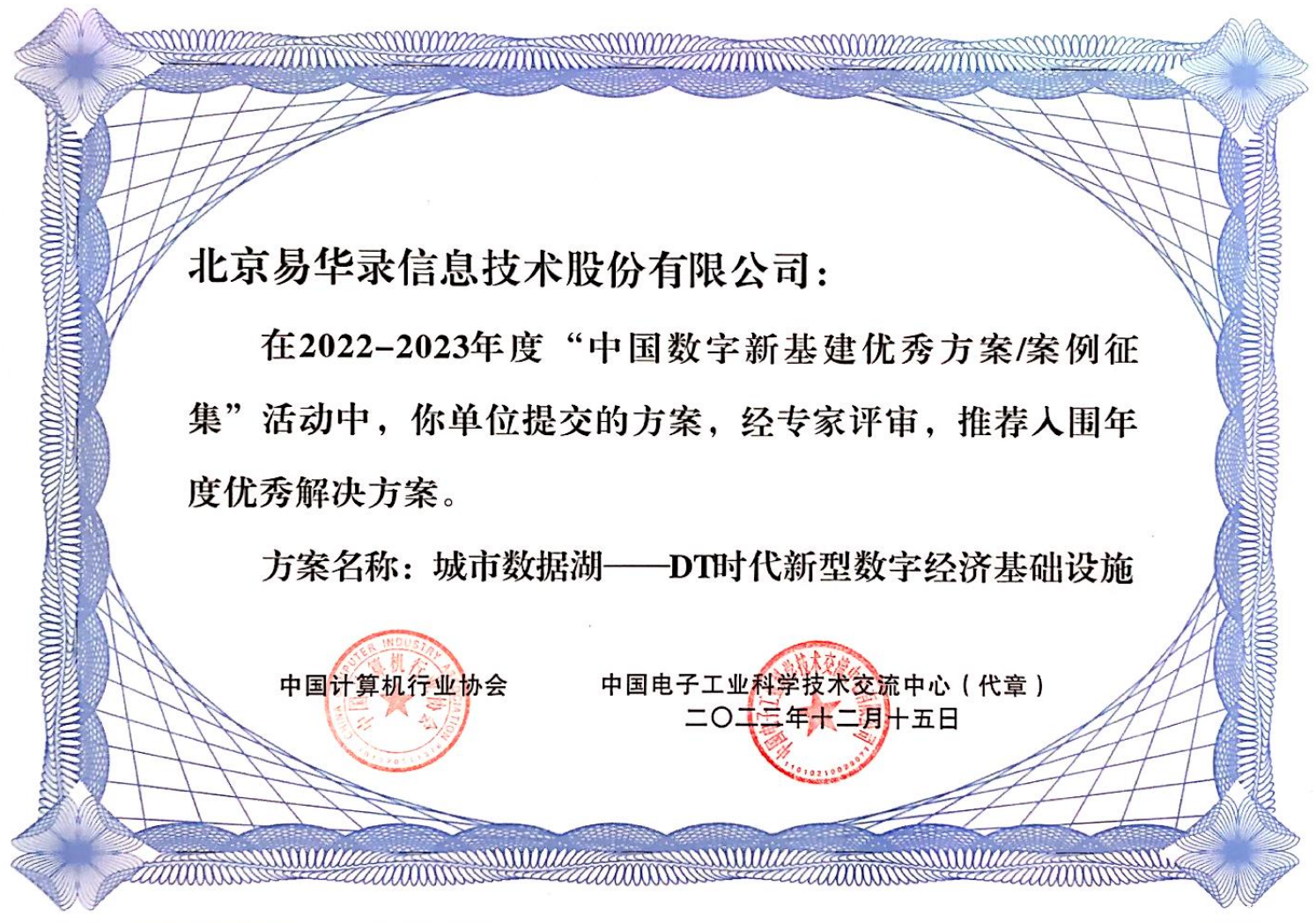 近期,在中国计算机行业协会和中国电子工业科学技术交流中心联合举办的2022-2023年度“中国数字新基建优秀方案/案例征集”活动中,伟德app手机下载官网安卓版《城市数据湖——DT时代新型数字经济基础设施》方案成功入选中国数字新基建年度优秀解决方案。