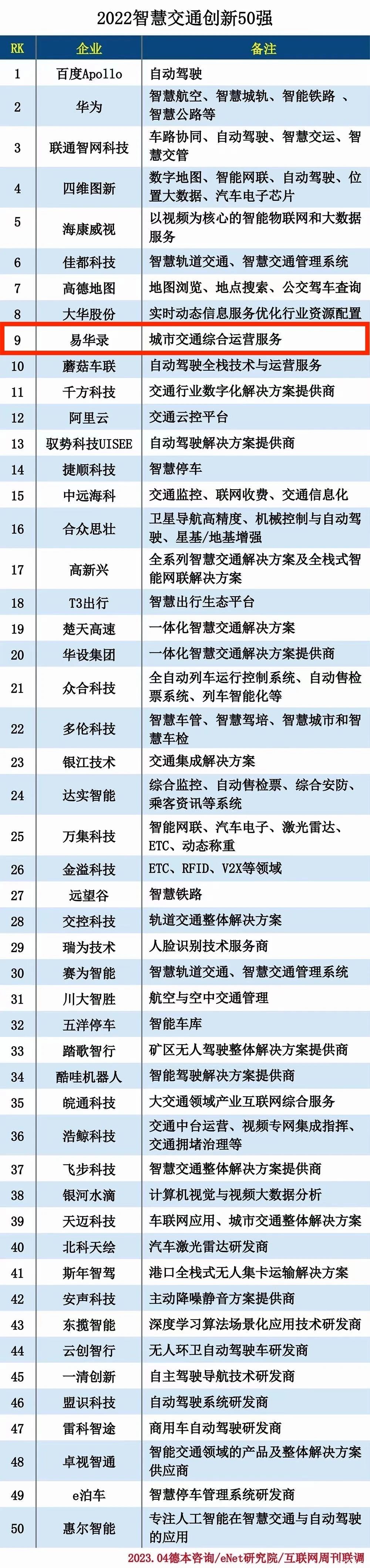 4月6日,在中国科学院《互联网周刊》与德本咨询、eNet研究院联合发布的“2022智慧交通创新50强”榜单中,伟德app手机下载官网安卓版位列其中,排名第9位。