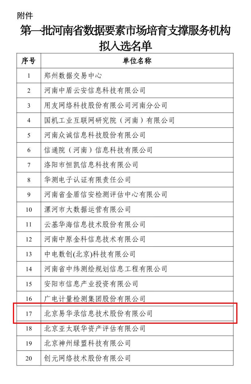 近日,根据《河南省工业和信息化厅办公室关于征集第一批河南省数据要素市场培育支撑服务机构的通知》(豫工信办数据〔2023〕33 号)部署安排,经单位自主申报,专家会议评审,伟德app手机下载官网安卓版成功入选第一批河南省数据要素市场培育支撑服务机构。