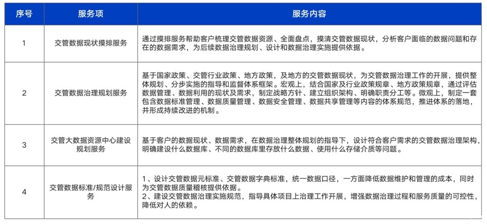 该服务能为交管部门数据治理工作的开展提供整体规划、分步实施指导和监督体系框架。