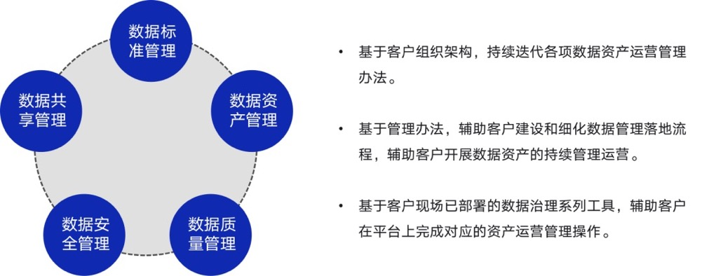 数据标准的落地、持续演进; 数据资产管运、数据安全管理、数据共享管理。