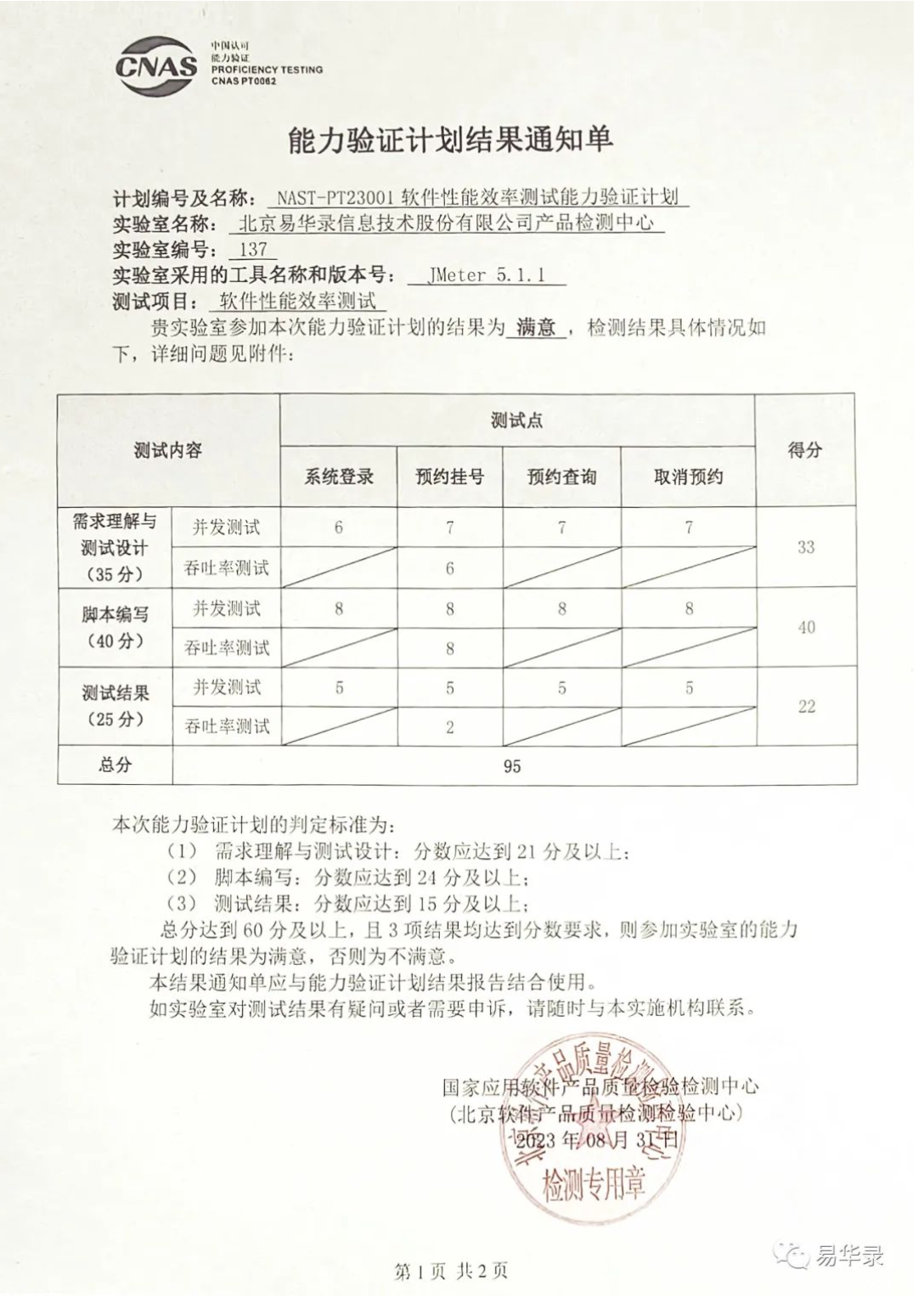 “NAST-PT23001”软件性能效率测试能力验证由国家应用软件产品质量检验检测中心组织实施,旨在考核国家已认可检验实验室在软件产品性能效率质量特性检测方面的综合能力,从而提高该领域检测结果的准确性和可比性,为该领域的实验室管理、认可和能力维持提供技术支持,是中国合格评定国家认可委员会(CNAS)判定实验室能力的重要技术依据之一。