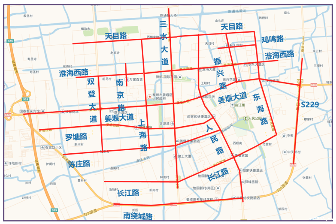 目前姜堰城区已优化7条道路(三水大道、姜堰大道、S229、陈庄路、双登大道、人民路、G328)。绿波速度,高峰期间40km/h-50km/h,平峰期间50km-60km/h,如无其他干扰因素,则可在一条路连续通过多个路口。目前,上述道路优化前与优化后相比,行程时间缩短约20%,停车次数减少约30%。