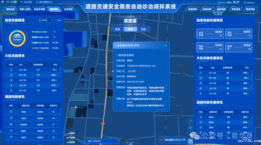 交通安全风险研判及管理系统包含道路交通安全隐患排查、道路交通安全风险研判及管理、道路交通安全风险协同共治三大子系统。系统整合人车出行、交通违法、各类交通事故、交通流运行、设施设备运行、警力资源安排等数据,基于交通大数据汇聚治理和价值挖掘技术,以“采集+溯源”为基础、“研判+排查”为手段、“协调+共治”为目标,实现交通安全管理“三个转变提升”,即由事后治理转向事前预防转变、由粗放管理向精细化闭环管理转变、由单一主体管理向多部门协同管理转变。