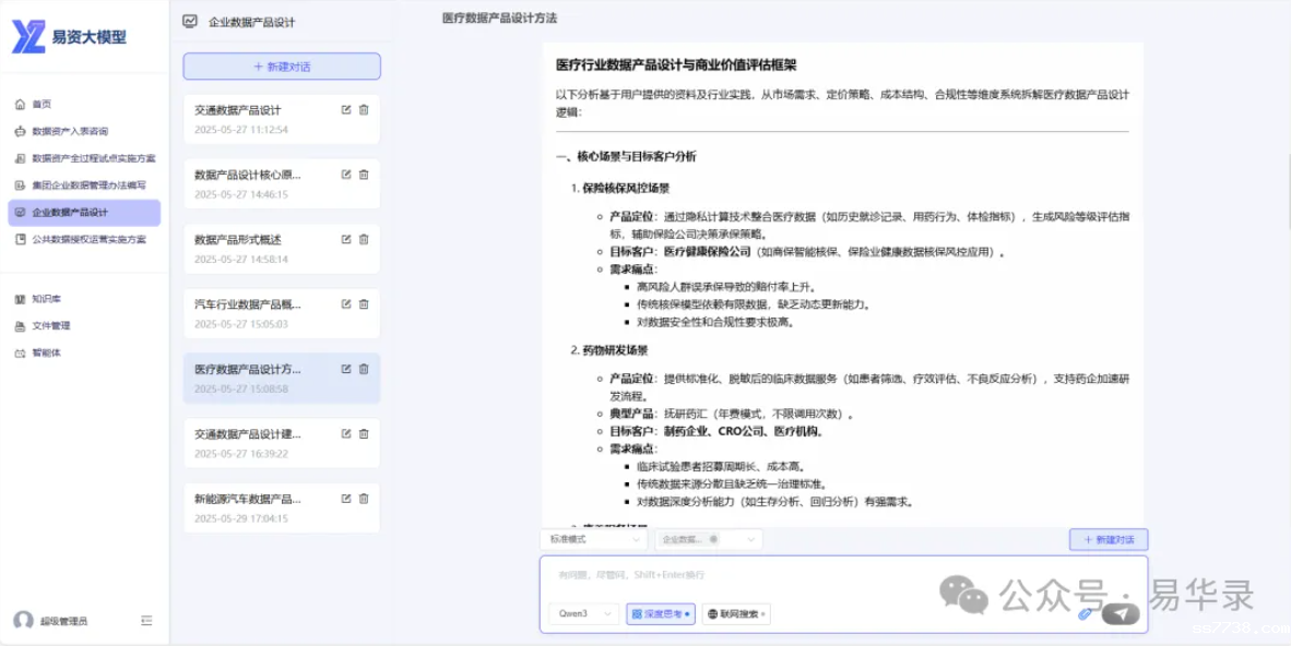 在数据资产价值评估与数据运营方面,“易资”大模型可以智能分析医疗、交通、金融、汽车、文博、农业等多行业数据,快速生成企业数据产品设计及流通运营方案,助力企业高效挖掘特色数据资源,开拓数据业务新蓝海。