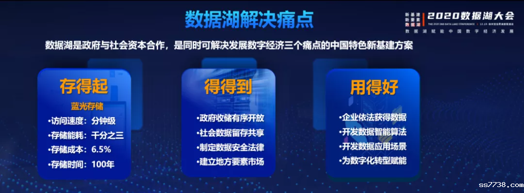 当前从瓦特经济发展到比特经济,数据成为重要的生产资料,发展数字经济必须要完成要素的收储、交易和治理——这些环节存在着存不起、得不到、不会用三个痛点。以蓝光存储技术为代表的新型存储技术,大大降低存储能耗与存储成本,并将存储时间延长至近百年,正在解决存不起的痛点;政府收储、有序开放一切公共数据,可以解决得不到的痛点;广大数字经济的从业企业依法获得数据,开发各种数据算法和应用场景,可以解决不会用的痛点。在这一基础上推出的城市数据湖,是政府与社会资本合作,同时解决发展数字经济三个痛点的一个中国特色的数字经济新基建方案。